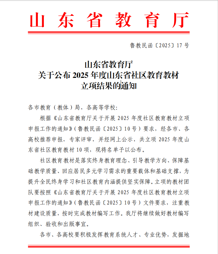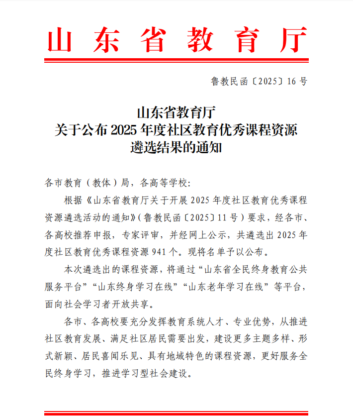 近日,山东省教育厅组织开展的社区教育优秀课程资源遴选和社区教育教材立项工作结果公布,我校10门课程成功入选优秀课程资源,2项教材获批立项。