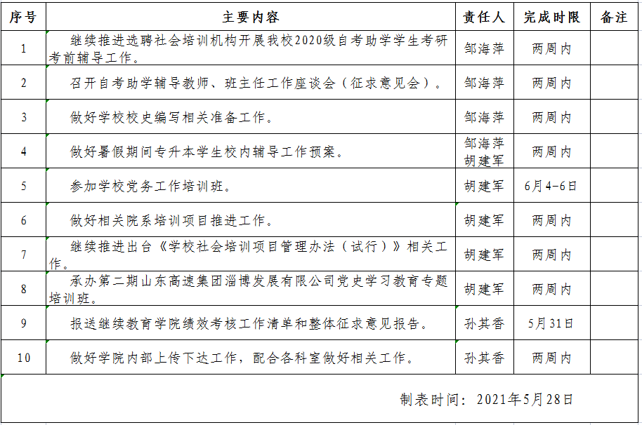 继续教育学院第15、16周工作计划表(2021.5.31—6.13)