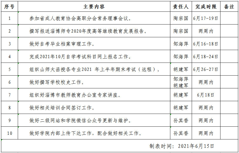 继续教育学院第17、18周工作计划表(2021.6.14—6.27)