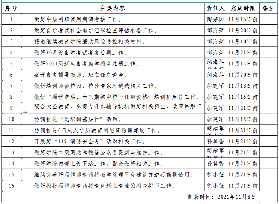 继续教育学院周工作计划表(2021.11.8-11.21)