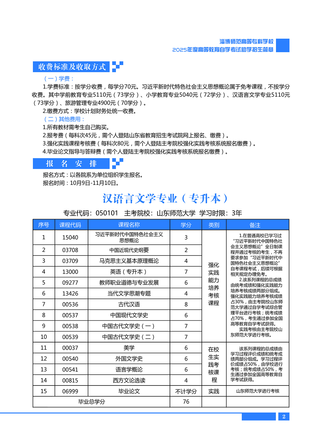 淄博师范高等专科学校2025年度高等教育自学考试助考招生简章——汉语言文学专业
